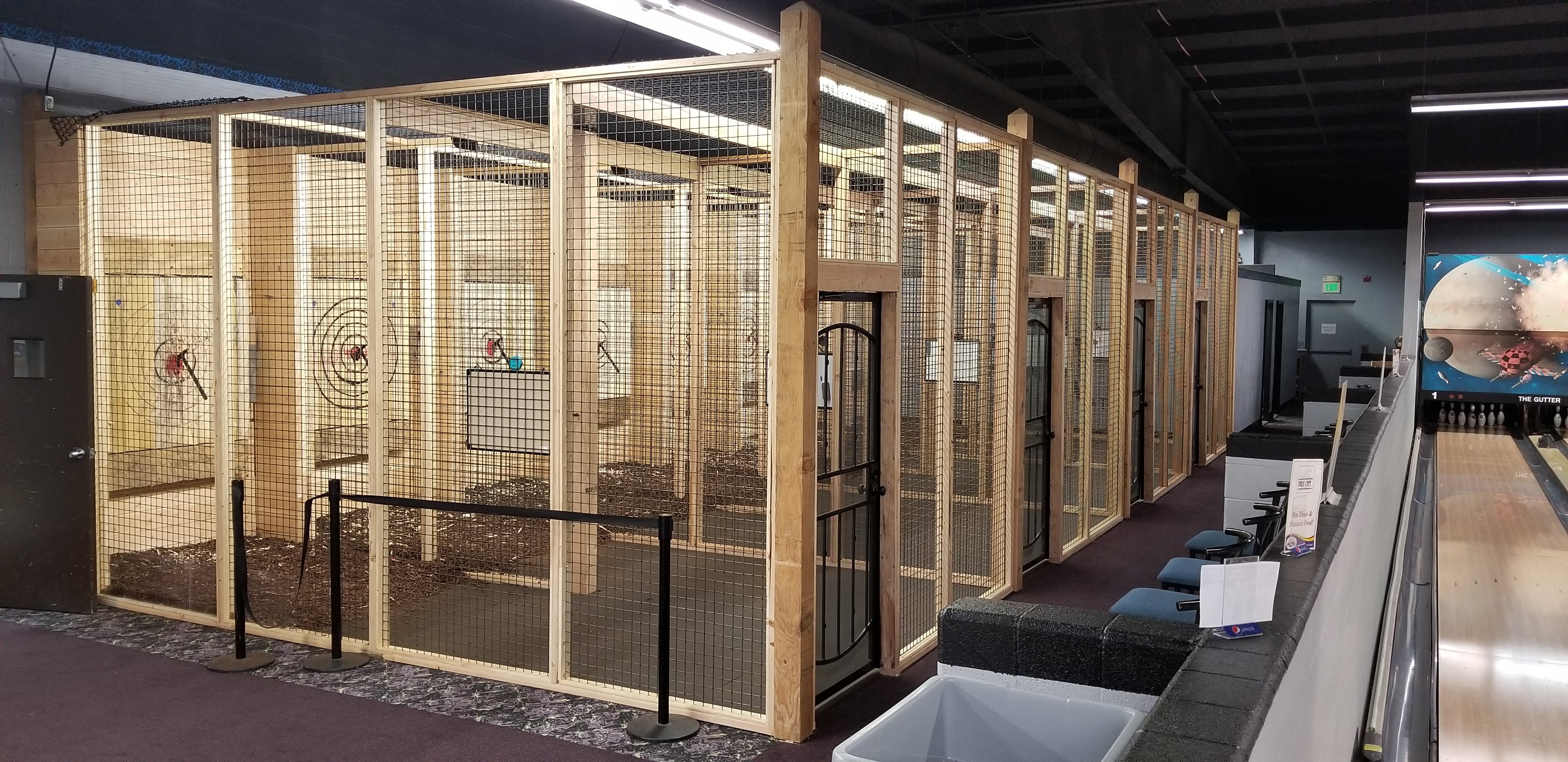 Lumberjacked is located inside the Gutter (our bowling center) adjacent to our Gutter Party Rooms. We have four (4) fully enclosed bays with two (2) throwing lanes each for a total of eight (8) lanes. We can accommodate up to 40 throwers per hour (10 throwers per bay per hour).